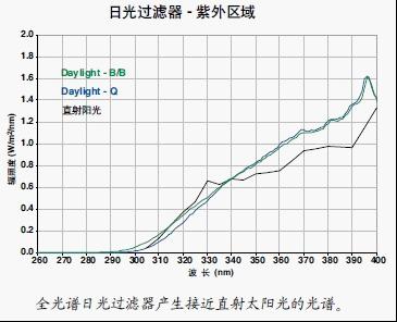 日光、延展紫外线、或窗玻璃过滤器用来降低不需要的辐射,获得接近测试材料最终应用条件的光谱。氙灯模拟户外曝晒条件时通常使用日光过滤器。氙灯试验箱所有款式和型号的日光过滤器,都必须符合ISO 4892、ISO 11341 或 ASTM G155 中的光谱要求。它们产生的光谱非常接近直射太阳光。