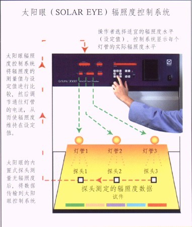 由上图可知,Q-sun通过主板控制灯管的光照强度,灯管发光后,由机器内部的光照强度传感器探头感应到光强,再反馈回主板进行分析比较,然后再进行调节,直到实际的照度值与设定值一致。当照度设定好后,整个调节过程由机器自动进行。