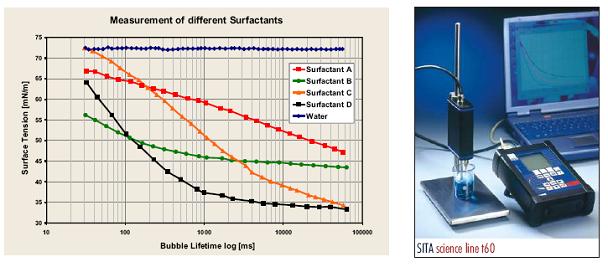表面活性剂被广泛应用于许多工业中,用于改善产品性能。因此就需要检验和分析表面活性剂的行为。表面活性剂主要的特点是它们的表面活性,即它们扩散和吸附到新形成界面并影响其表面张力。因此,对于许多用途而言必须要知道表面活性剂的吸附过程快慢,以及在短时间内表面张力的下降速度。由于表面张力依赖于表面活性剂的含量,所以我们可以通过测定表面张力的含量来分析表面张力。此外,温度同样会影响表面张力;测量表面张力也可以用于分析一种或多种表面活性剂混合的临界胶束浓度。