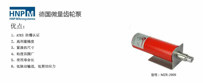 MZR-2909微量输液泵拥有紧凑型设计、广泛的粘度范围和尺寸小等特点,能够用来连续输送和离散的剂量的水状溶液,溶剂,油和其它粘性液体。