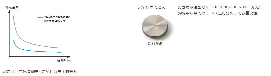X射线荧光分析可以通过延长测定时间增加X射线荧光的计数从而提高精度(重现性)。搭载高计数率SDD检测器的EDX-7000/8000/8100与以往型号相比,能够在更短的时间内保证分析精度。