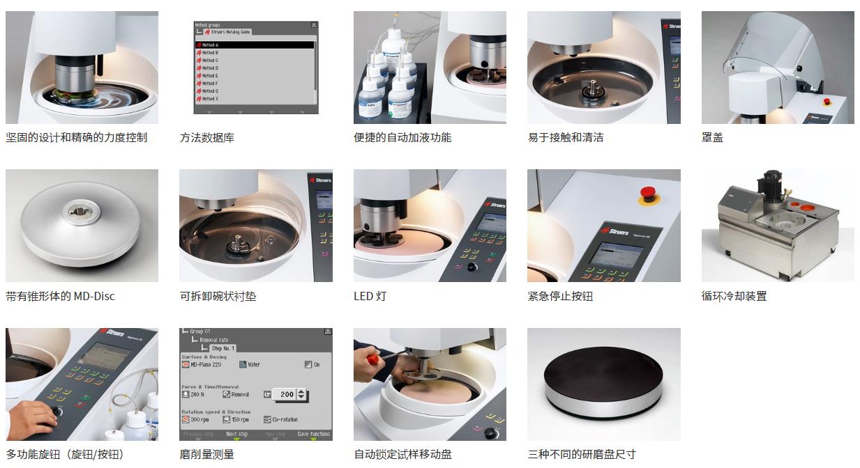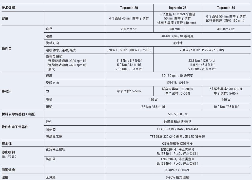 用于在包括圆锥体的 200 mm MD-Disc 上研磨和抛光试样的微处理器控制的自动机器。加液模块,包括圆锥体的 MD-Disc 以及试样夹具座需要单独订购。可订购包括或者不包括透明盖板的 Tegramin-20。