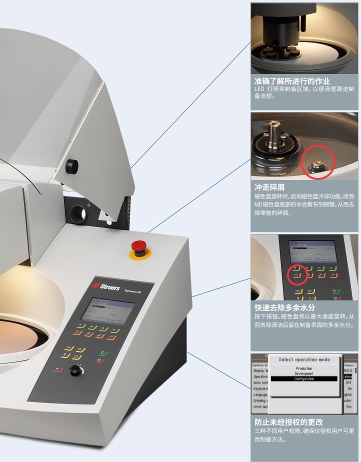 Tegramin 专为在金相检测时实现准确、可再现的制备结果而设计。Tegramin 研磨/抛光机采用紧凑型设计,配备一体化试样移动头和自动工艺控制,外加人性化操作模式,这使其具有独特而无可匹敌的优势。Tegramin 的所有功能都是与经验丰富的金相学专家合作开发的,以很大程度提高制备质量并快速获得结果。