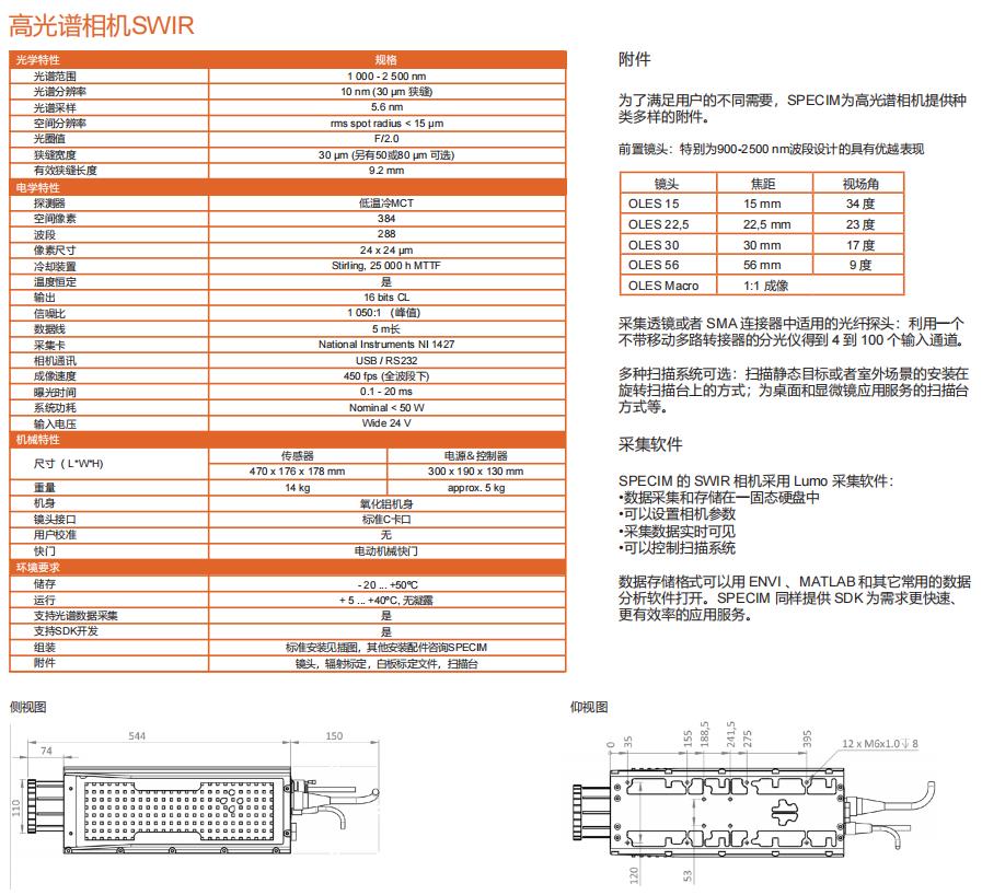 SWIR 高光谱相机是SPECIM 在短波红外波段研发的一款性能优越的高光谱相机。这款相机拥有全新的设计和制造工艺,是短波红外高光谱相机中重大的突破。相机在保持高速数据采集(450 fps )的同时,拥有更高的空间分辨率(384 像素),并且为了适应室内或室外多变的采集环境,SWIR 相机采用耐磨防水外壳IP54 以及配备半导体恒温装置,隔绝外界环境的影响,保证数据的准确性。为了确保在不同条件下的室内/室外使用,它现在具有坚固的防风雨 IP54 外壳和温度稳定的光学元件,SWIR 相机高性能的配置反而比上一代具有更低的能耗,仅仅只有50W 。